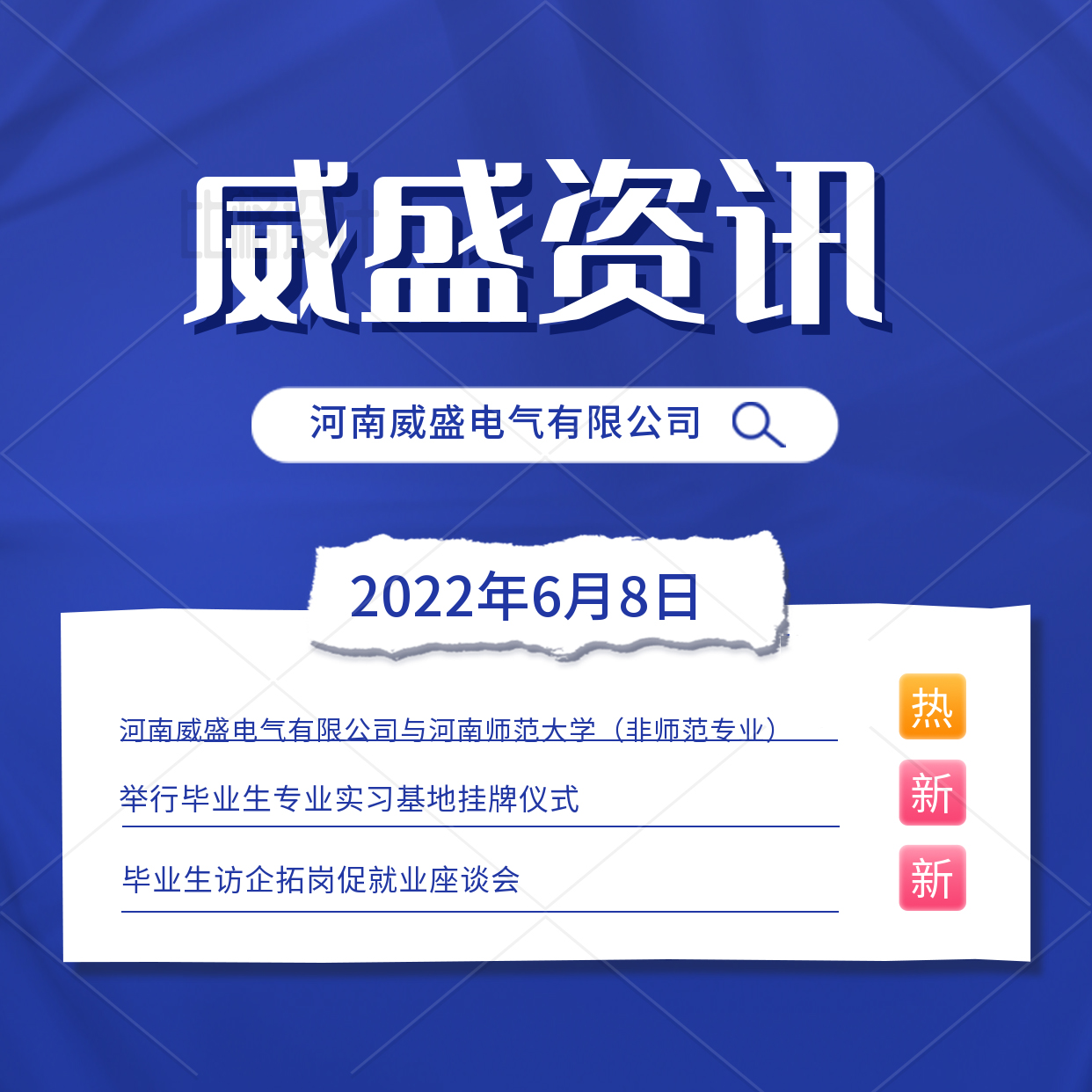 6月8日,河南威盛電氣有限公司與河南師范大學(xué)舉行專業(yè)實(shí)習(xí)基地掛牌儀式,首先河南威盛電氣有限公司董事長(zhǎng)婁總代表全體公司員工對(duì)河南師范大學(xué)到來(lái)的老師和畢業(yè)生表示熱烈的歡迎,希望通過與河南師范大學(xué)全方位、多角度、多層次的開展合作,提升合作層次、拓展合作空間、增強(qiáng)合作實(shí)效,實(shí)現(xiàn)優(yōu)勢(shì)互補(bǔ)、互利共贏和內(nèi)涵式發(fā)展,創(chuàng)新人才培養(yǎng)方式、提高人才培養(yǎng)質(zhì)量和增強(qiáng)社會(huì)服務(wù)能力。